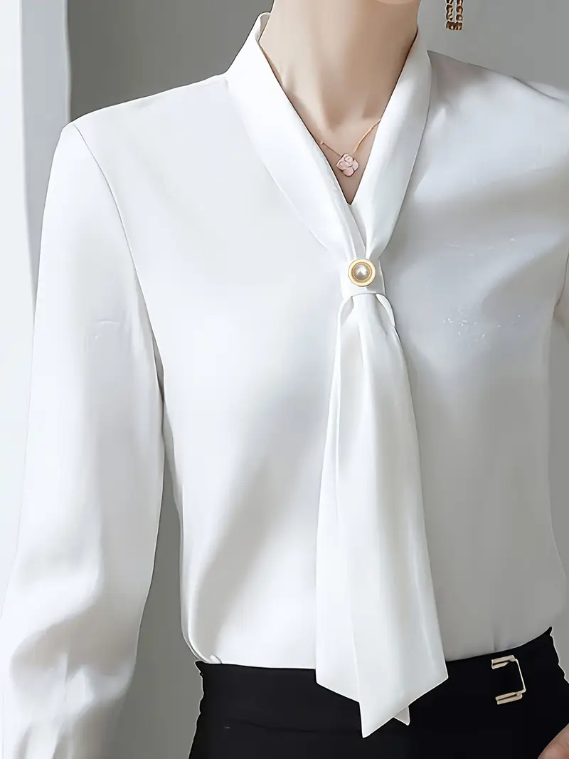 قميص أنيق بأكمام طويلة على شكل حرف V مع زينة ربطة عنق، مصنوع من بوليستر 100% بلون موحد، بقصة عادية، مزود بصف أزرار مفرد، قماش منسوج، وزن 120 جرام/م²، مناسب لجميع الفصول – أزياء النساء