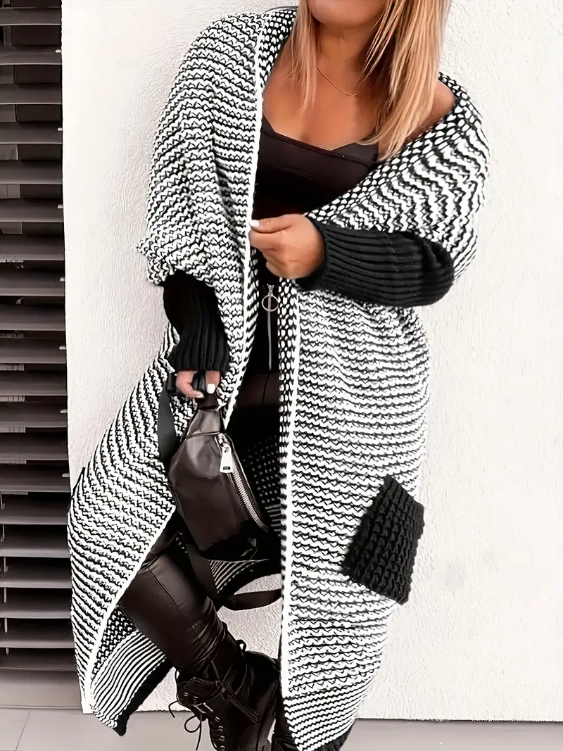 كارديغان نسائي كاجوال متوسط الطول بألوان أسود وأبيض أنيق – بياقة على شكل V، معطف سويتر محبوك مع جيوب، مثالي لموضة الخريف/الشتاء