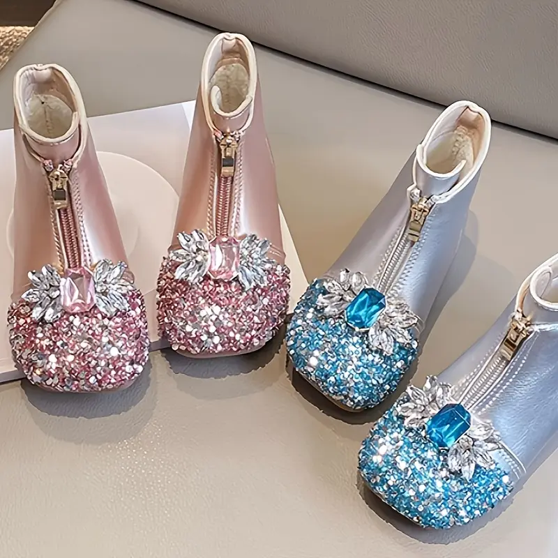 أحذية الفتيات اللامعة - مبطنة بالمخمل الناعم، مزينة بالراينستون، مقاومة للماء، مثالية للأعراس والأناقة اليومية، إغلاق بسحاب سهل، مادة PU متينة