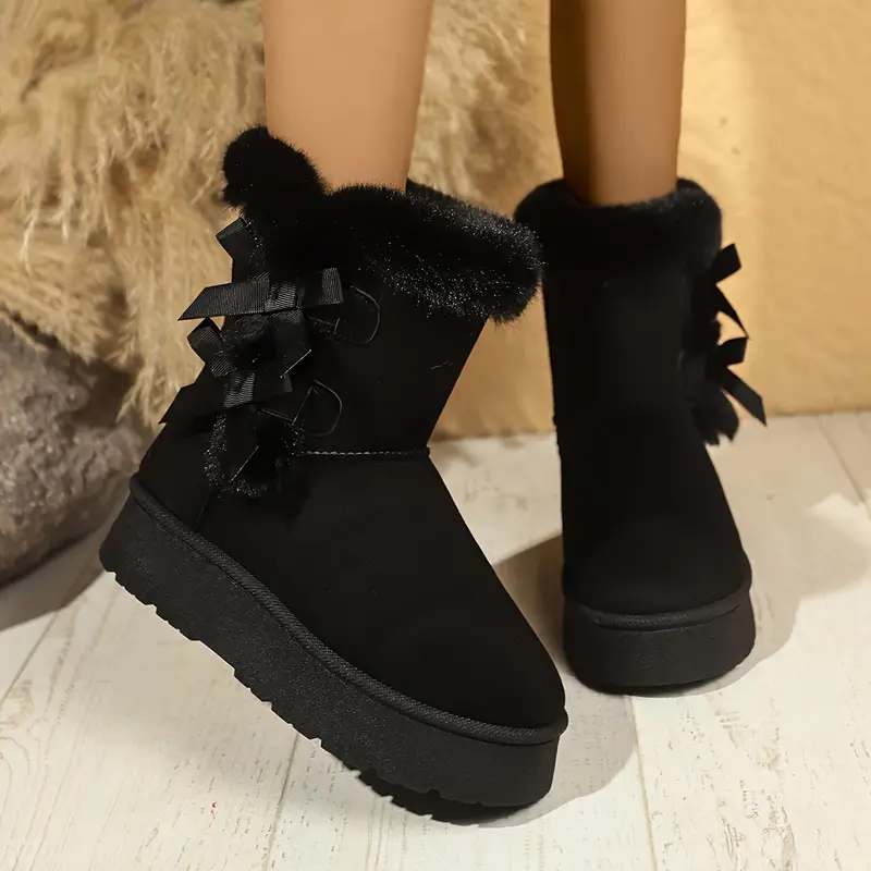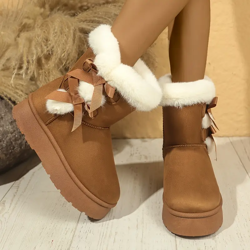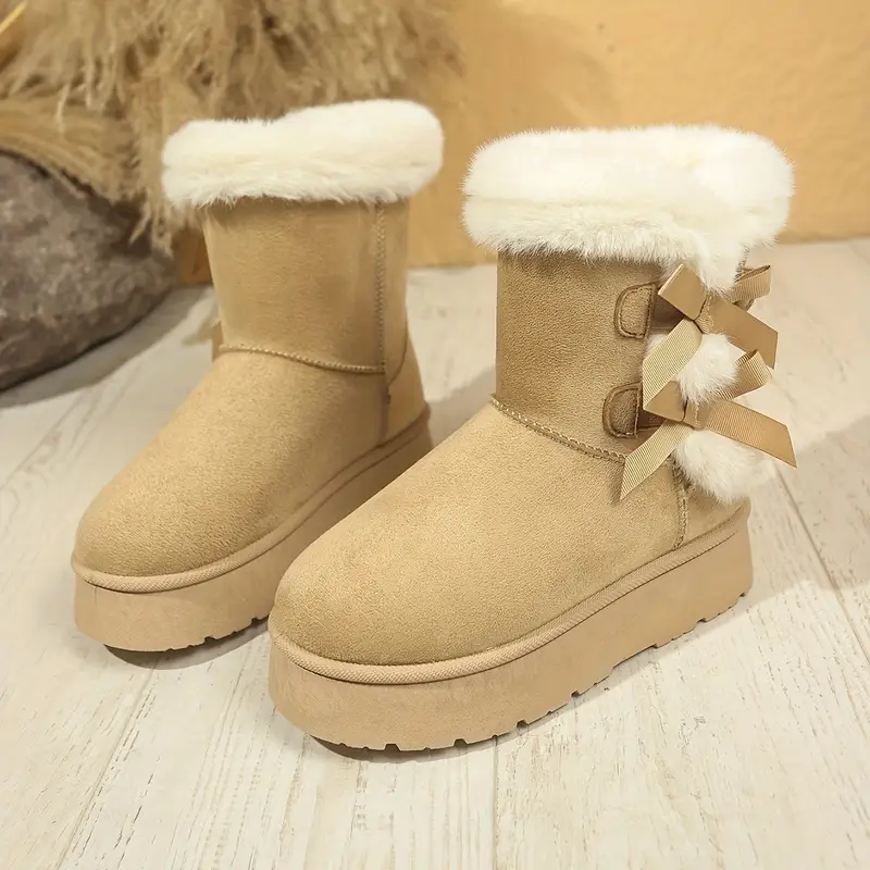 أحذية ثلج شتوية دافئة للنساء بدون رباط مع نعل مطاطي سميك، بطانة فرو مريحة، وربطة زينة – خيارات أسود وبيج لراحة الطقس البارد، أحذية شتوية