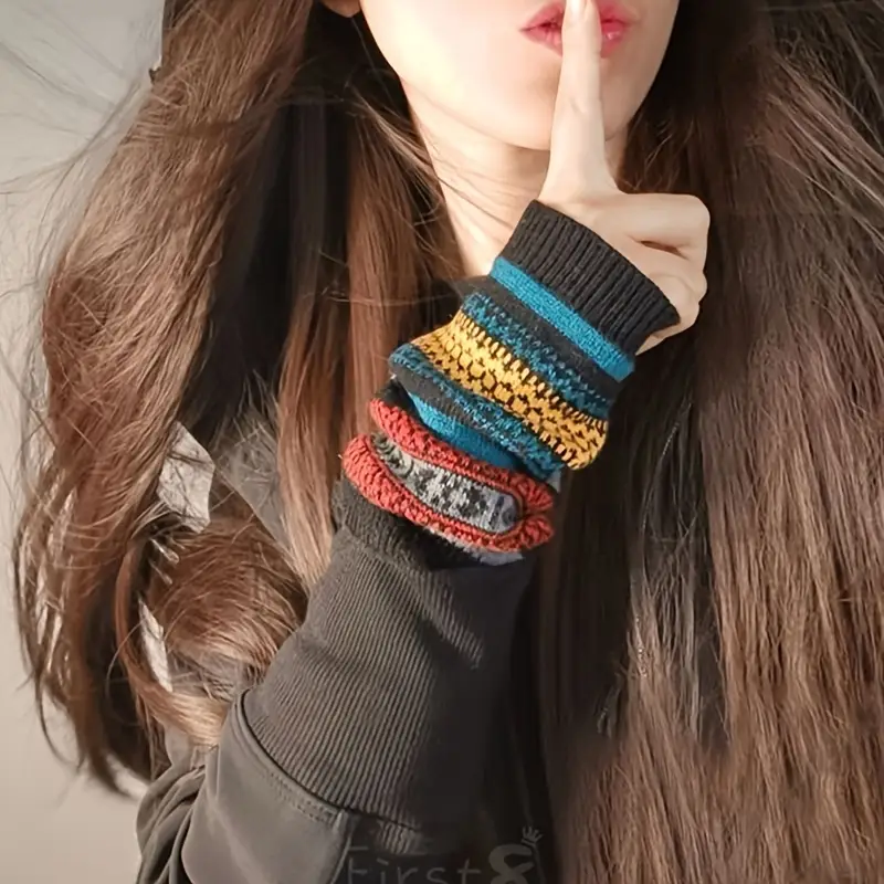 أكمام ذراع محبوكة بنمط بوهو للنساء - تصميم شتوي ملون مرن بتقنية النسيج المصبوغ بالغزل، خالٍ من الريش، مصنوع من مادة البولي أميد للدفء، مناسب للخروج