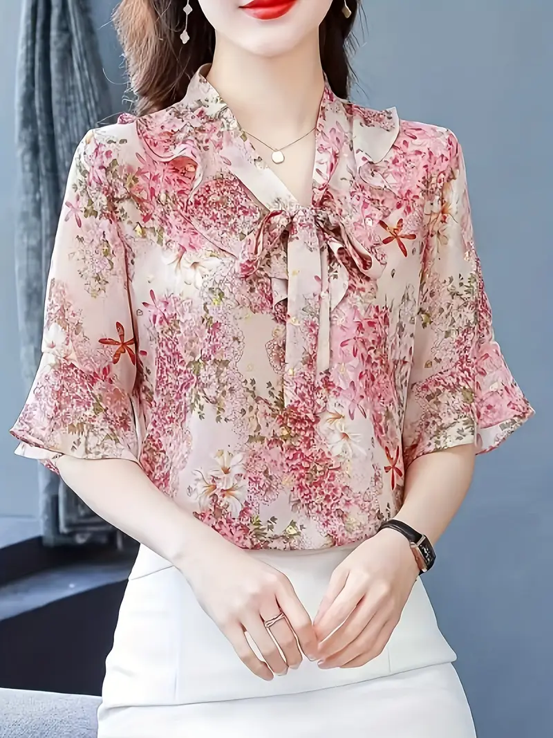 بلوزة شيفون أنيقة بنقشة زهور مع ياقة V كشكشة – قمة صيفية تنحيف للنساء، قابلة للغسل في الغسالة