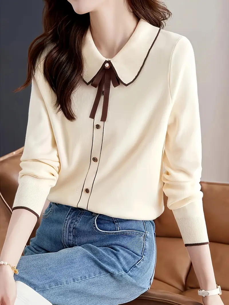 بلوزة نسائية محبوكة بياقة دمية، بأكمام طويلة، مثالية لتنسيق الخريف، سترة عصرية وجذابة