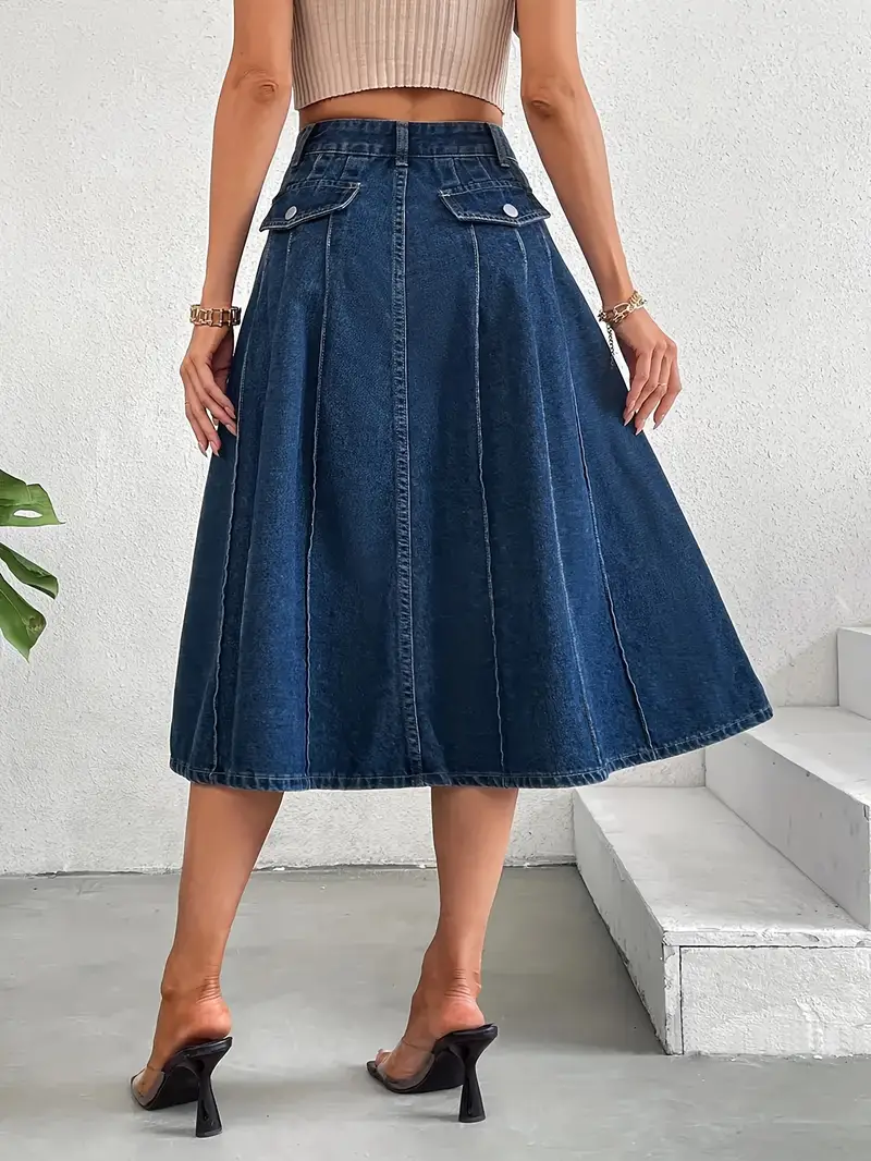 تنورة دينم ميدى مطوية أنيقة للنساء – خليط رايون، غير مطاطية، لون سادة مع جيوب زائفة