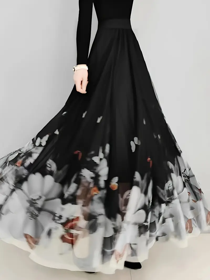 تنورة نسائية أنيقة على شكل حرف A – بوليستر وسباندكس، تصميم فراشة وزهور، غير مطاطية، لمسة نهائية لامعة، مثالية لجميع الفصول، ملابس لكل موسم|تنورة بنقوش زهور|خليط بوليستر وسباندكس