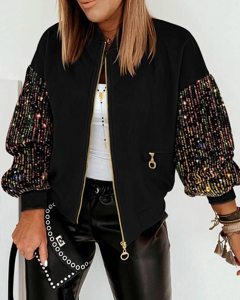جاكيت لامع بأكمام طويلة وتصميم بسحاب مع جيوب ومزين بالترتر المتباين