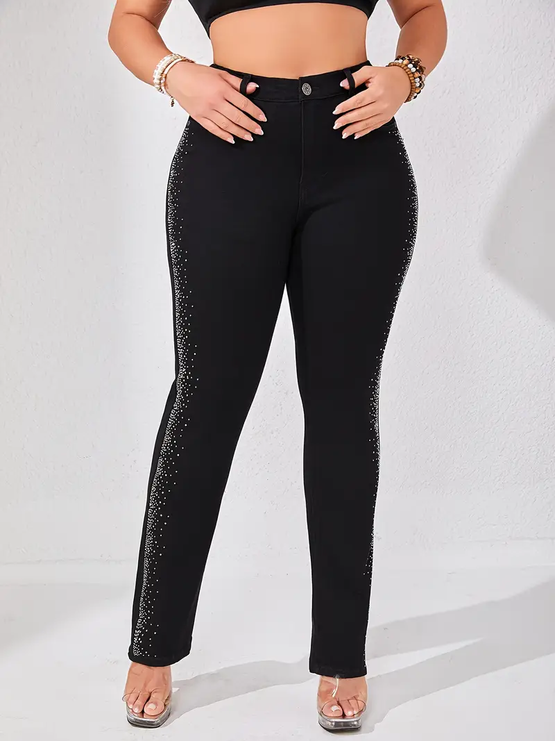 جينز دنيم مزين بحجر الراين بتصميم عتيق، مقاس كبير، حزام خصر مرن بلون موحد، قماش متوسط المرونة، موضة الربيع/الخريف