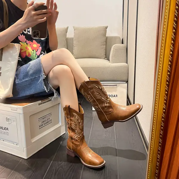 حذاء نسائي من Doc Martens باللون البني بتصميم غربي مطرز على طراز رعاة البقر الغربي