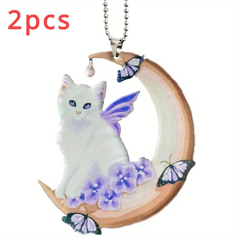 2-حزمة الاكريليك يجلس القط مع أجنحة والقمر شنقا الحلي، سحر سلسلة المفاتيح مع تفاصيل الأزهار والفراشة، زينة 2D الفن هدية المعلقات