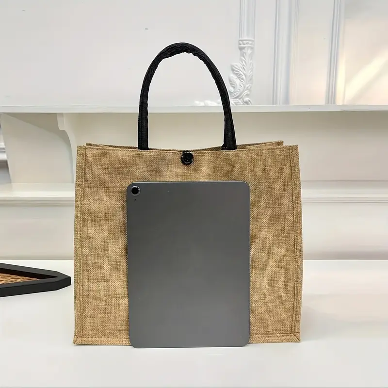 حقيبة توت بطباعة رمضان أنيقة – حقيبة يد خفيفة من الخيش للتسوق والسفر على الشاطئ، لون كاكي