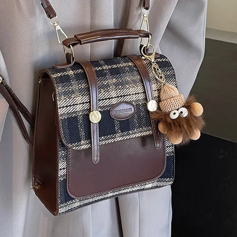 حقيبة يد منقوشة على الطراز البريطاني مع إغلاق بإبزيم، حقيبة ظهر قابلة للتحويل كاجوال على الموضة للنساء، حقيبة ظهر صغيرة متعددة الاستخدامات للسفر جديدة على الموضة لعام 2024 مع سحاب بوم بوم – غسيل يدوي أو تنظيف احترافي