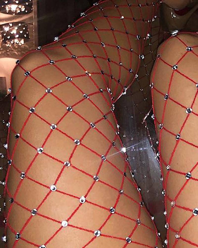 زوج واحد من الجوارب الشبكية الطويلة حتى الفخذ والمزينة بأحجار الراين