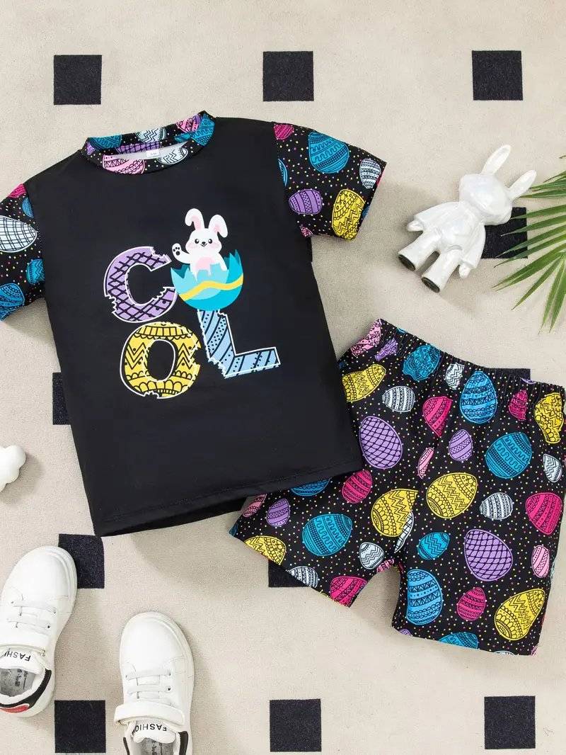 زي عيد الفصح مكون من قطعتين للأولاد، يتضمن تي شيرت بأكمام قصيرة وشورت، مع طباعة حروف رائعة وتصميم بيض منتشر على ظهر التي شيرت الأسود، مع شورت أسود يحمل أيضًا طباعة البيض، مناسب للخارج.
