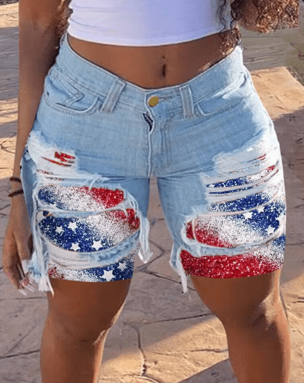 شورت جينز ممزق بحاشية خام ومطبوع عليه علم يوم الاستقلال
