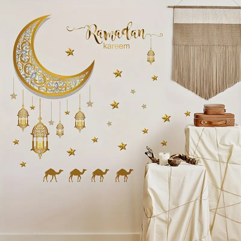 ملصق حائط تقليدي لشهر رمضان الكريم على شكل قمر ونجوم، لاصق ذاتي من PVC لغرفة المعيشة أو النوم، للاستخدام الفردي، شكل مستطيل، سطح بلاستيكي متوافق