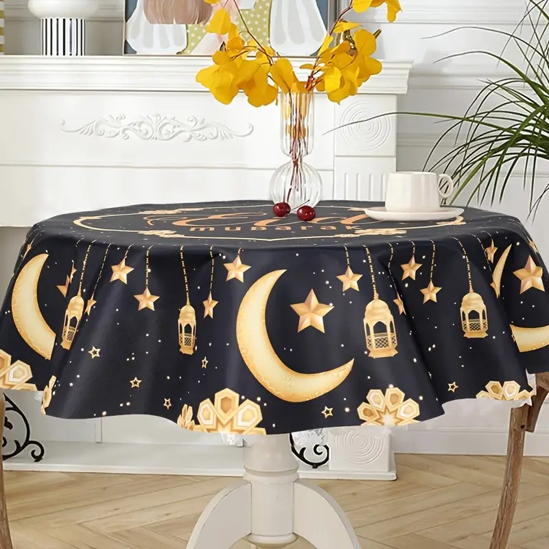 طاولة مستديرة بمقاس 150 سم، بتصميم أسود وذهبي مع هلال ونجوم وقصر، مصنوعة من البوليستر، مثالية لتزيين المنزل خلال رمضان، مستلزمات حفلات إسلامية، هدايا عيد الفطر.