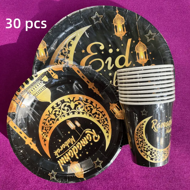 طقم أدوات مائدة للاحتفال برمضان مكون من 30 قطعة، أطباق وأكواب ورقية بتصميم النجوم والهلال بمناسبة عيد الفطر، أطباق بحجم 23.01 سم و18.01 سم، مستلزمات حفلات عيد مبارك، زينة احتفالية