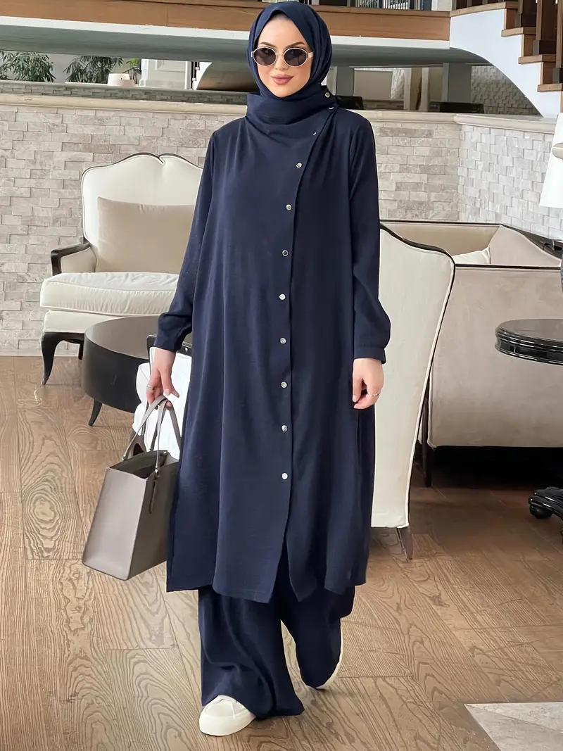 طقم نسائي عصري مسلم من قطعتين للربيع والخريف 2024، قميص بأكمام طويلة وبنطلون بأسلوب العباءة العربية،