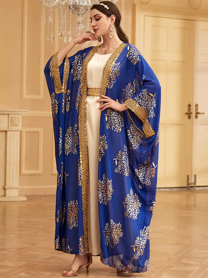 عباءة مطبوعة بأكمام باتوينج – فستان سهرة فاخر من البوليستر للنساء، بحزام خصر، حافة غير متماثلة، مثالي لرمضان والمناسبات الرسمية، زي رمضان|حزام ذهبي|تطريز متقن