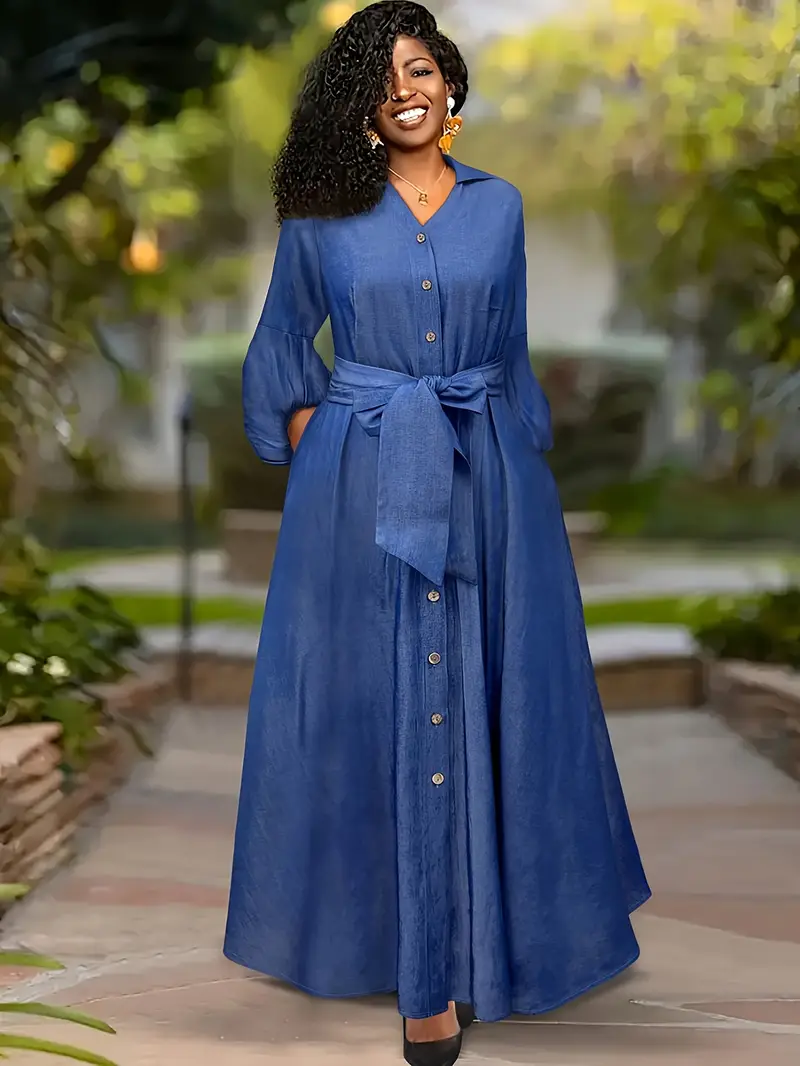 فستان أنيق برقبة على شكل V وأكمام طويلة مع حزام وجيوب – بوليستر، قابل للغسل في الغسالة – مثالي للربيع/الخريف