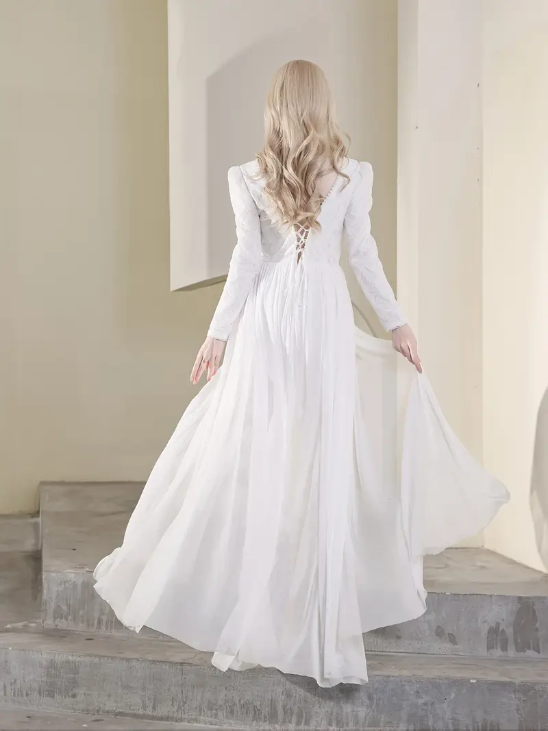 فستان زفاف أنيق برباط دانتيل على شكل حرف V للنساء، فستان طويل الأكمام على شكل حرف A مع حافة شبكية شفافة