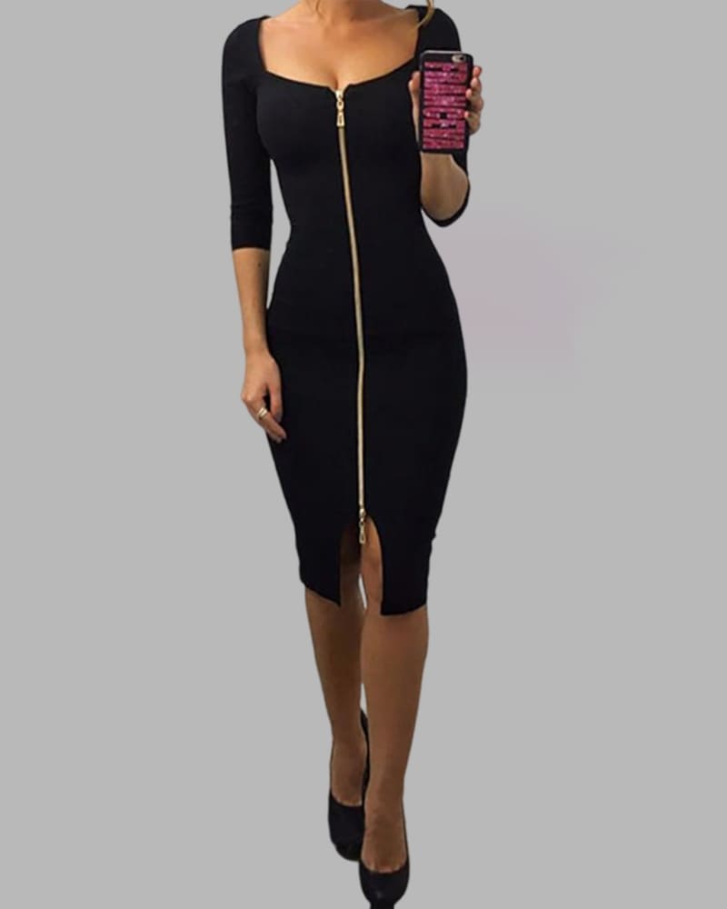 فستان ضيق بأكمام نصفية ورقبة مربعة وفتحة أمامية كاملة بسحّاب
