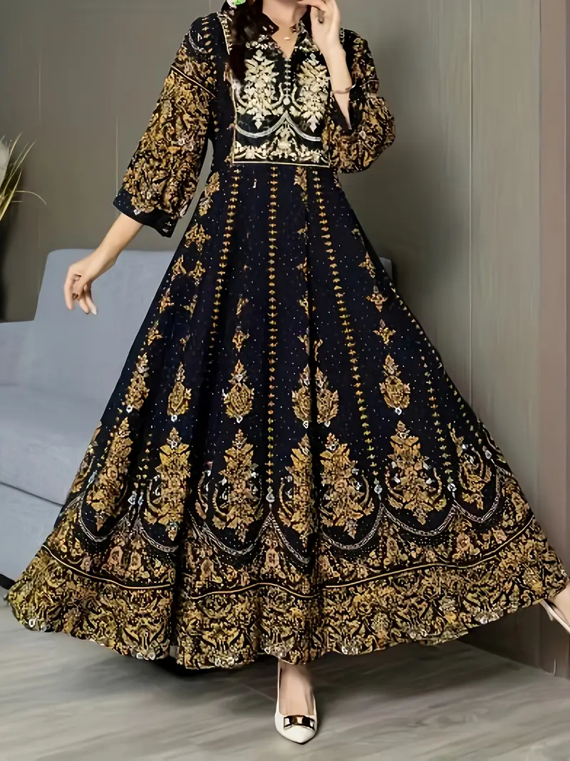 فستان طويل بطبعة زهور للعنق بأكمام 3/4، أنيق للإجازات، ملابس نسائية