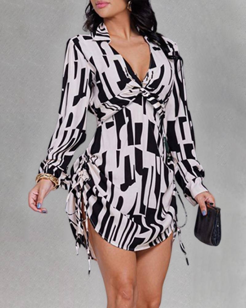فستان قميصي مطبوع بالكامل برباط جانبي ملتوي وفتحة رقبة على شكل حرف V