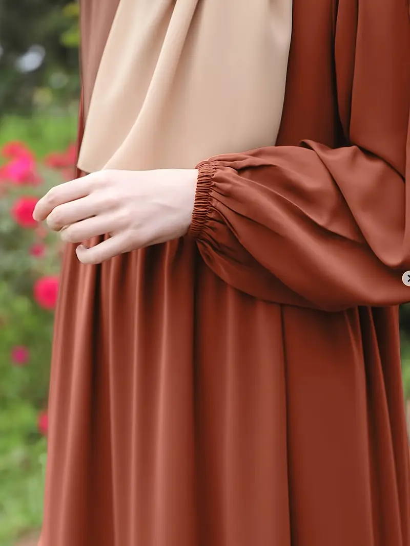 فستان ماكسي أنيق بأكمام طويلة للنساء، مصنوع من 100% بوليستر بلون موحد، بتصميم نمط قديم، يناسب جميع الفصول مع تفاصيل حزام، قماش منسوج، 140 جرام – ملابس محتشمة عصرية للمسلمات