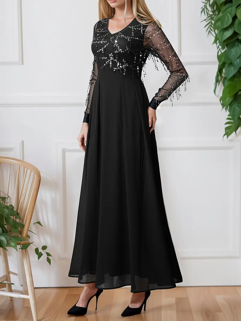 فستان ماكسي أنيق بأكمام طويلة ورقبة على شكل V مع ترتر – كاجوال، خليط بوليستر مطاطي، قابل للغسل في الغسالة – مثالي للربيع/الصيف/الخريف، ترتر، شبكة، أكمام طويلة