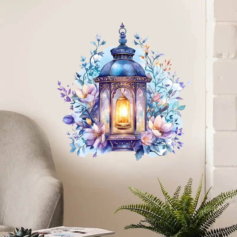 1 قطعة ملصق جداري مُشرق لرمضان مبارك – تصميم فانوس زهري حالم، ملصق PVC ذاتي اللصق، تشطيب مطفي لأجواء منزلية ودافئة وغرفة نوم، مثالي للاحتفالات الإسلامية، ديكور منزلي إسلامي