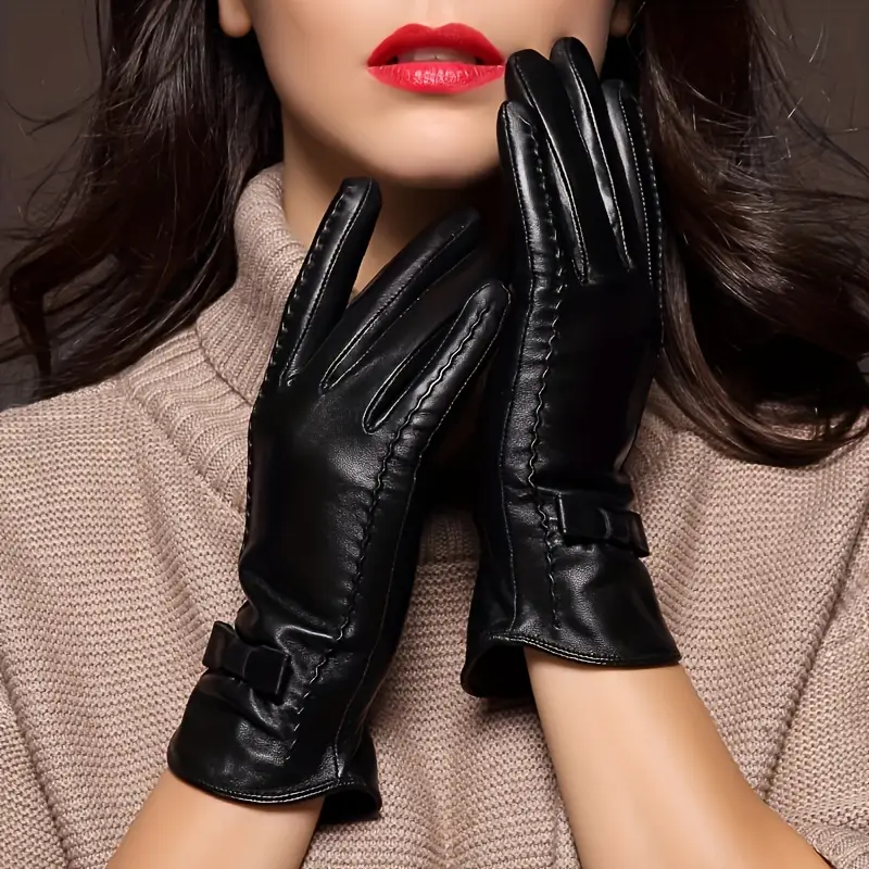 قفازات شتوية نسائية من الجلد الطبيعي – دافئة، سميكة مع شاشة لمس وتفاصيل فيونكة أنيقة لركوب الدراجات والقيادة، جلد الغنم الأسود، حماية من الطقس البارد، قفازات القيادة | قفازات جلدية أنيقة | بطانة ناعمة