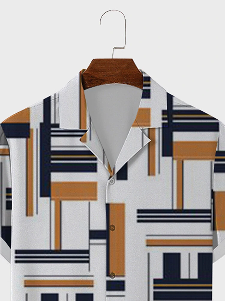 قمصان رجالية بياقة ريفر المطبوعة الهندسية الكاجوال قصيرة الأكمام – أبيض S
