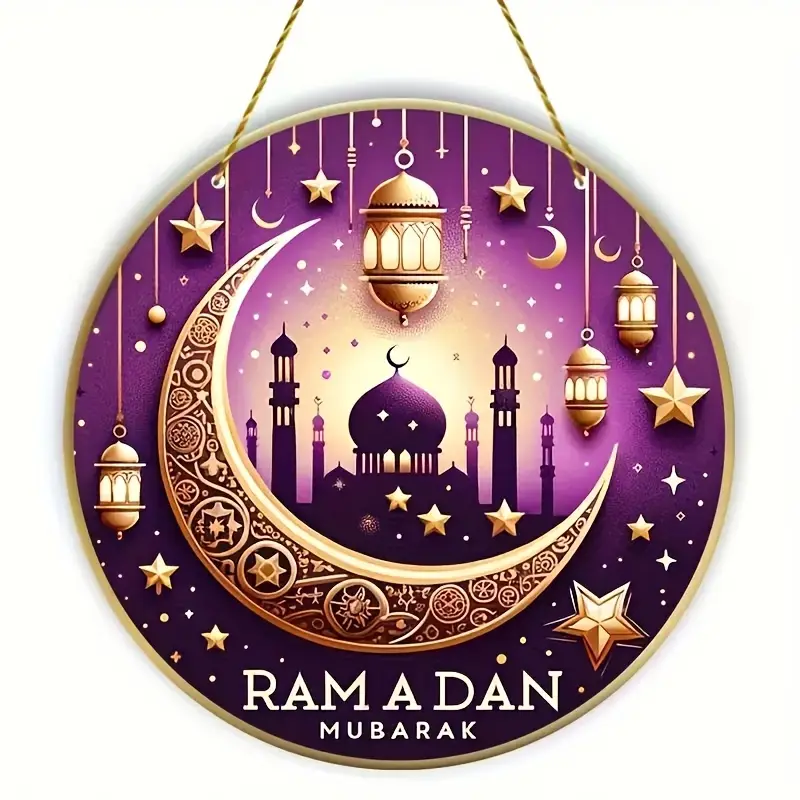 لافتة باب احتفال رمضان – زينة خشبية دائرية تقليدية للتعليق في غرفة المعيشة والفناء، مثالية لعيد الفطر ورأس السنة