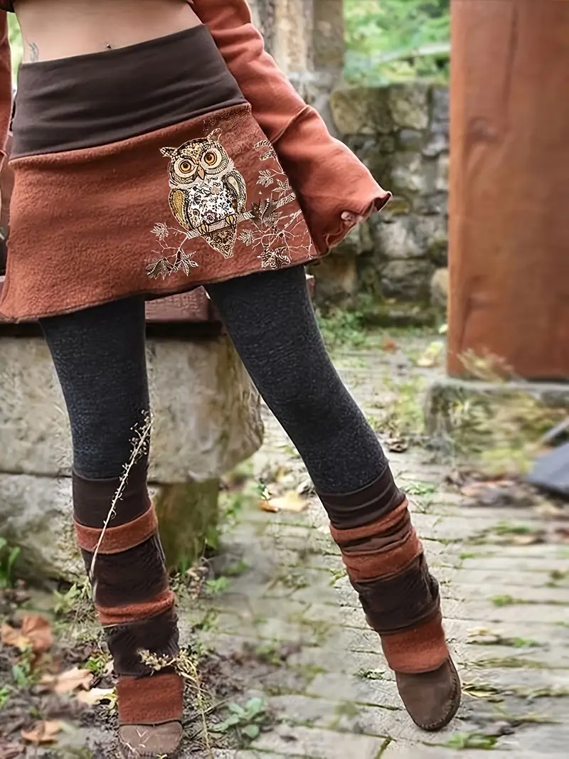 ليجنز مطاطي بطبعة بومة بألوان متباينة مستوحاة من الفينتاج مع تفاصيل تنورة متعددة الطبقات وهمية – خصر عالٍ، بوليستر مريح، قابل للغسل في الغسالة للملابس الكاجوال
