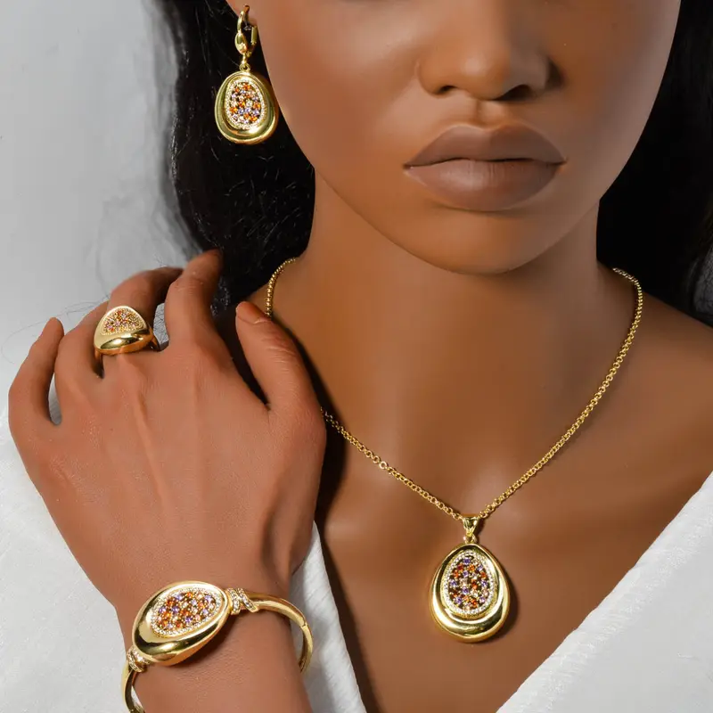 مجموعة مجوهرات نسائية من 5 قطع بتصميم بوهيمي عتيق مزين بالزركونيا الملونة والبريق، تتضمن قلادة وسوار وخاتم وأقراط، مناسبة للنساء الأنيقات والأنيقات لحفلات الزفاف وعيد رمضان وأعياد الميلاد
