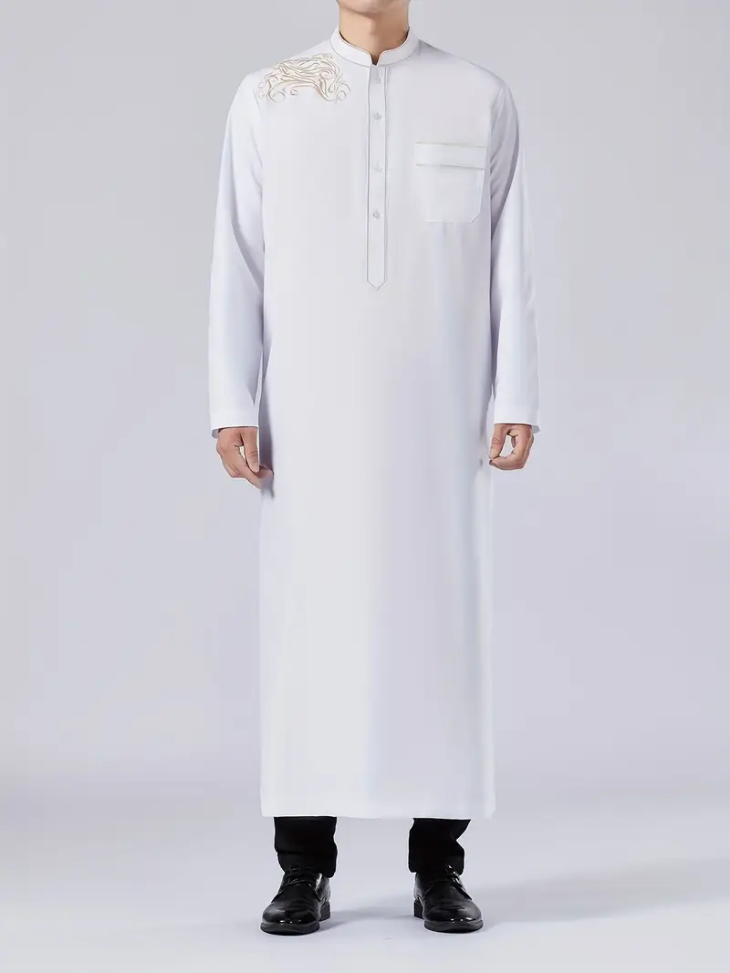 1 قطعة كندرية مطرزة للرجال – 100% بوليستر بأكمام طويلة وياقة طاقم مع جيب، نمط إسلامي متوسط الشرق الأوسط غير رسمي،