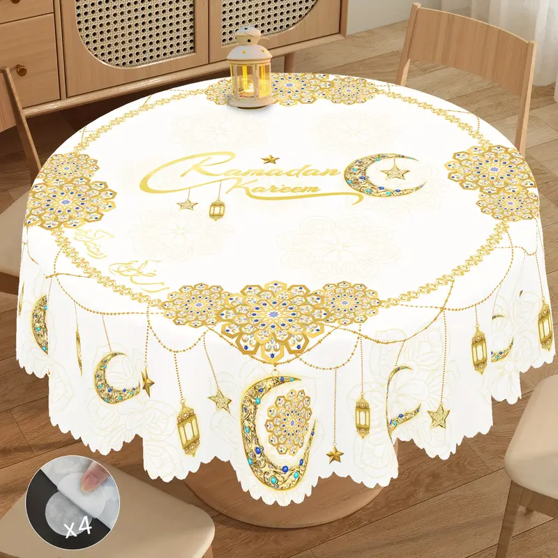 1 قطعة مفرش طاولة مستطيل مُذهب أبيض لعيد مبارك الربيع + 4 قطع ذاتية اللصق، سلسلة ذهبية، قمر، نجوم، طباعة فانوس إسلامي، مفرش طاولة دائري، مفرش طاولة لحفلات العطلات، زينة خارجية، مفرش طاولة بحجم كبير، إكسسوارات المطبخ، مفرش طاولة بأسلوب رمضان المغربي كهدية للعائلة والأصدقاء