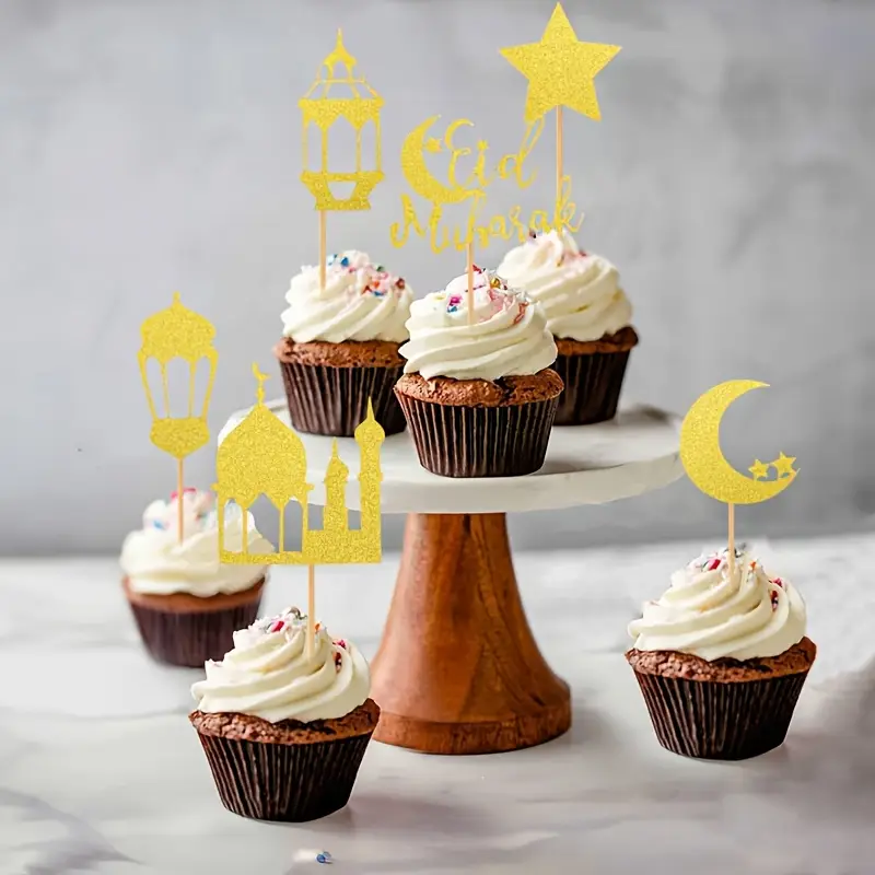12 قطعة من أعواد الكب كيك رمضان، مزينة بنمط إسلامي لعيد مبارك ورامadan Kareem، لا حاجة للطاقة، بدون ريش، مع نجوم لامعة وقمر هلال لتزيين الكعك